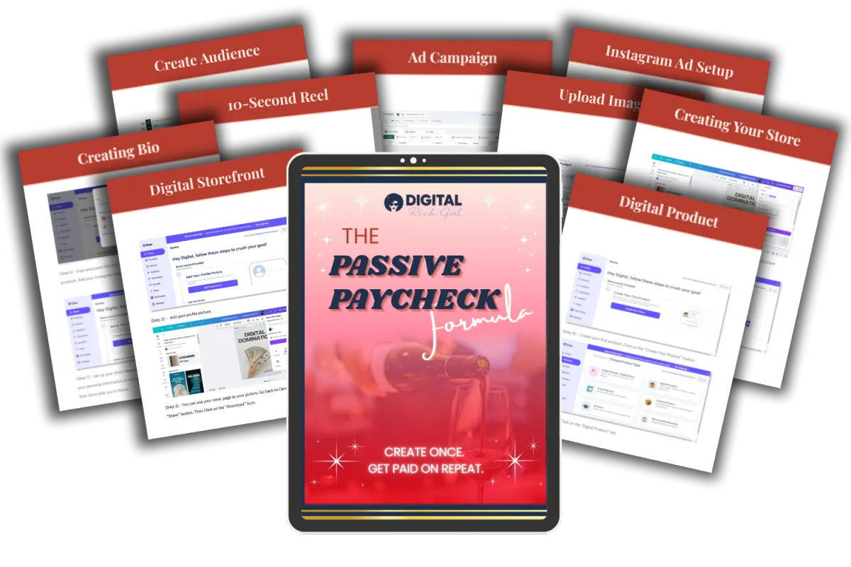 The main Passive Paycheck Formula guide: a 54-page PDF document with step-by step instructions on rebranding a product, setting up a Stan Store, creating an Instagram account, setting up Meta ads with datasets, and much more!